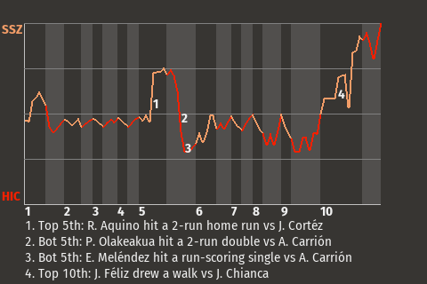 2 (4, 4th Inning off V. Martínez, 1 on, 0 outs; 6th Inning off V. Martínez, 0 on, 1 out)