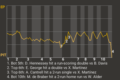 The decisive blow was delivered by Maikel de Braber in the bottom of the tenth when he hit a 2-run home run off 26-year old right-handed pitcher Warner Alder to win the game for Pittsburgh. The home crowd went nuts.