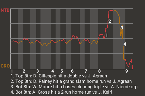 Al Gross, who was drafted in the 3rd round of the 2060 draft, chipped in a 2-run home run for Crowley in the bottom of the eighth. For the game, the first baseman had 2 hits in 4 at-bats with 1 home run, 1 single, 1 run scored, and 2 RBI.