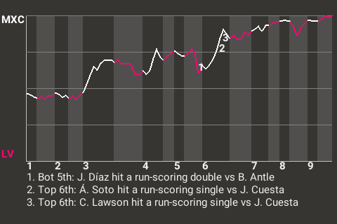 With Mexico City leading 3-2 in the top of the sixth, Ángel Soto hit a run-scoring single off Las Vegas pitcher Javier Cuesta. It put the Blue Demons ahead 4-2.
