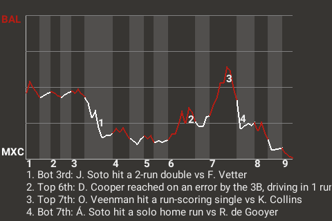 Mexico City took a 4-3 lead on Ángel Soto's 6th home run of the season. The solo home run, which Soto hit in the bottom of the seventh, left Baltimore pitcher Roger de Gooyer visibly frustrated.