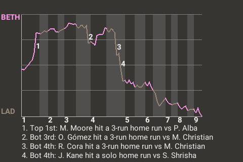 The Angel Kitties had been locked in a 0-0 tie with the Music going into the bottom of the fifth inning. That changed quickly when the 20-year old second baseman Sonny Burns came to the plate. Burns hit a 3-run home run on a first pitch curveball from Bethlehem hurler Ángel García. It was Burns's 3rd home run of the year.