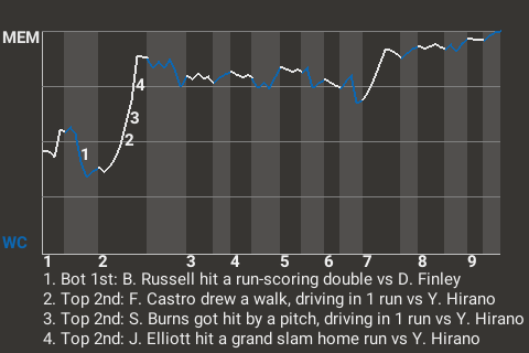 With Memphis leading 3-2 in the top of the second, Elliott hit a fastball from Yakamochi Hirano for a grand slam home run. It was his 3rd home run of the season and put the Music ahead, 7-2.