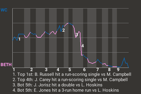 Jones contributed a big hit, a 3-run home run, for Bethlehem in the bottom of the fifth. With his team trailing 2-1, Jones took a fastball from Larry Hoskins and stroked the home run to right. His 9th home run of the season allowed the Angel Kitties to leap in front, 4-2.