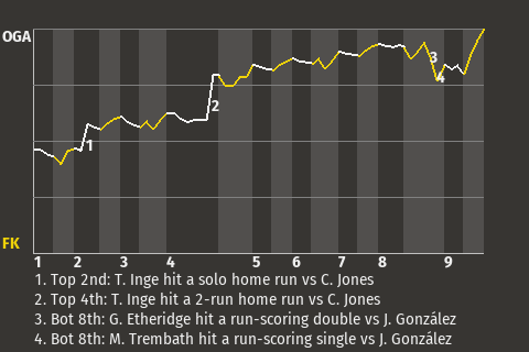 2 (18, 1st Inning off C. Jacobs, 1 on, 1 out; 4th Inning off J. López, 1 on, 2 outs)