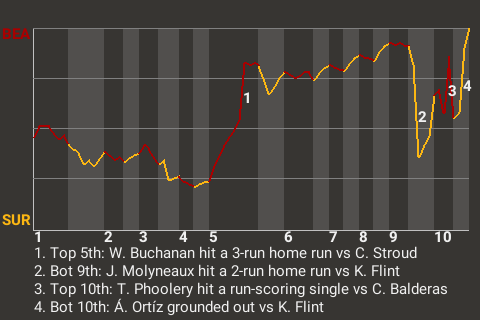 John Wagner, who is tied for 7th in the SA- in stolen bases with 8, chipped in a solo home run for Surprise in the bottom of the fourth. For the game, the left fielder had 2 hits in 4 at-bats with 1 home run, 1 single, 1 run scored, and 2 runs batted in.