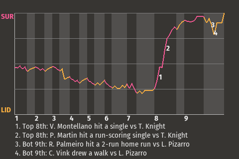 3 (10, 3rd Inning off J. Guzmán, 0 on, 1 out; 7th Inning off J. Guzmán, 0 on, 0 outs; 9th Inning off J. Weber, 0 on, 0 outs)
