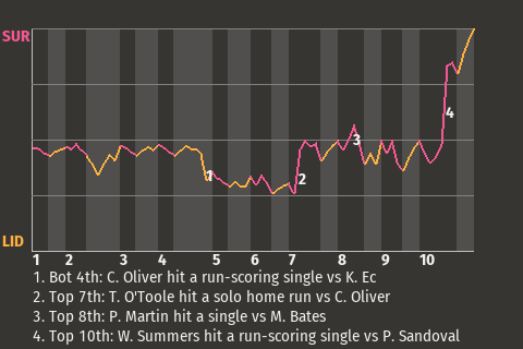 2 (12, 4th Inning off E. Chávez, 2 on, 2 outs; 7th Inning off P. Muñóz, 1 on, 0 outs)