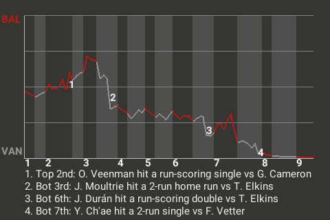 The 7-2 Vancouver win over Baltimore was due largely to Júlio Durán. The Grey Wolves right fielder was 3-4 with a home run and a double. He drove in 2 runs and scored once. Gregory Cameron was the winner. He's now 2-4. The loser was Ted Elkins. Vancouver goes to 28-28, Baltimore to 23-33.