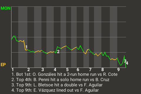 The Lakers got a big at-bat from first baseman Orlando Gonzáles, who in the bottom of the first hit a 2-run home run. It was his 6th home run of the season and put the Lakers on top, 2-0.