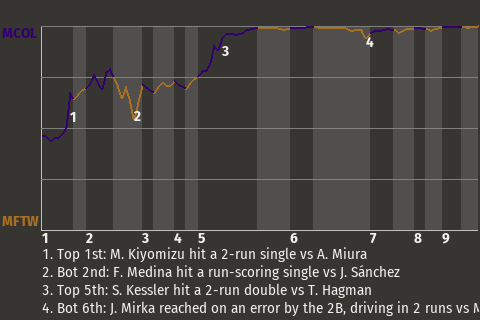 2 (2, 1st Inning off S. Saito, 2 on, 1 out; 4th Inning off M. Zavala, 0 on, 2 outs)