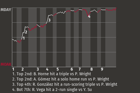 3 (5, 1st Inning off C. Camacho, 1 on, 2 outs; 3rd Inning off C. Camacho, 1 on, 2 outs; 9th Inning off A. Hernández, 1 on, 1 out)