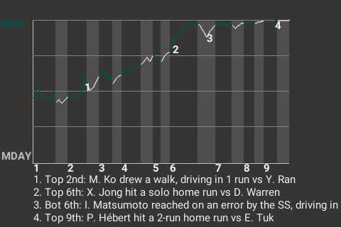 Min-u Ko went 1-4 with a walk. He drove in 3 runs and scored once for MSL Nova Scotia. The slick-fielding second baseman had a key at-bat in the top of the second. With two out and the bases loaded, he broke a 0-0 tie with a run-scoring walk off Yun Ran. It was his 11th walk of the season.
