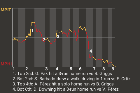 In the bottom of the sixth, MSL Philadelphia shortstop Donald Downing gave his team the lead. With no one out and runners on 1st and 2nd, Pizza hit his 6th home run of the year. MSL Pittsburgh pitcher Vicente Pérez surrendered it. With that, the Liberty jumped in front, 6-4.
