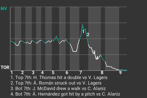 2 (5, 5th Inning off V. Lagers, 0 on, 0 outs; 7th Inning off V. Lagers, 1 on, 0 outs)