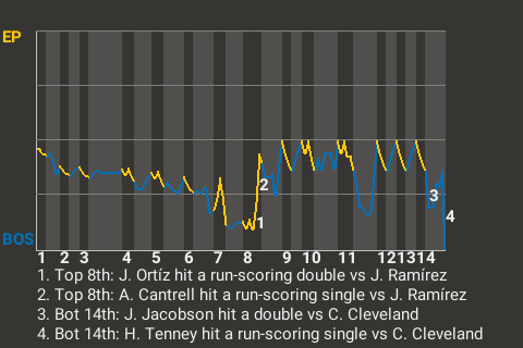 The clutch at-bat came in the bottom of the 14th inning, when Boston center fielder Herb Tenney, facing Colt Cleveland, had a run-scoring single. It gave the Patriots the 3-2 win.