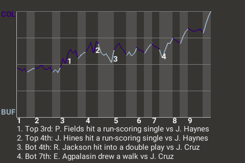 The Colorado Billy Goats downed the Buffalo White Walkers, 2-1, at Beyond the Wall. Stellar pitching by Juan Cruz had a lot to do with it. The right-hander handcuffed his opponent all game. Cruz picked up the win for Colorado, going 6.2 innings. He gave up 1 run on 4 hits. He now sports a record of 2-1. Earning his 7th save for Colorado was Min Der.